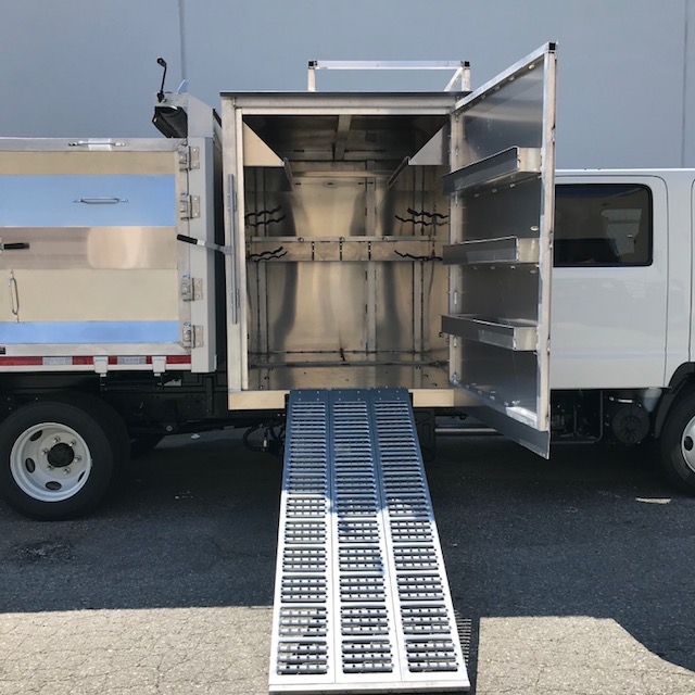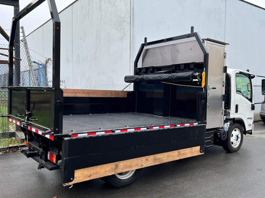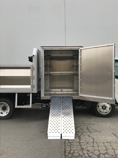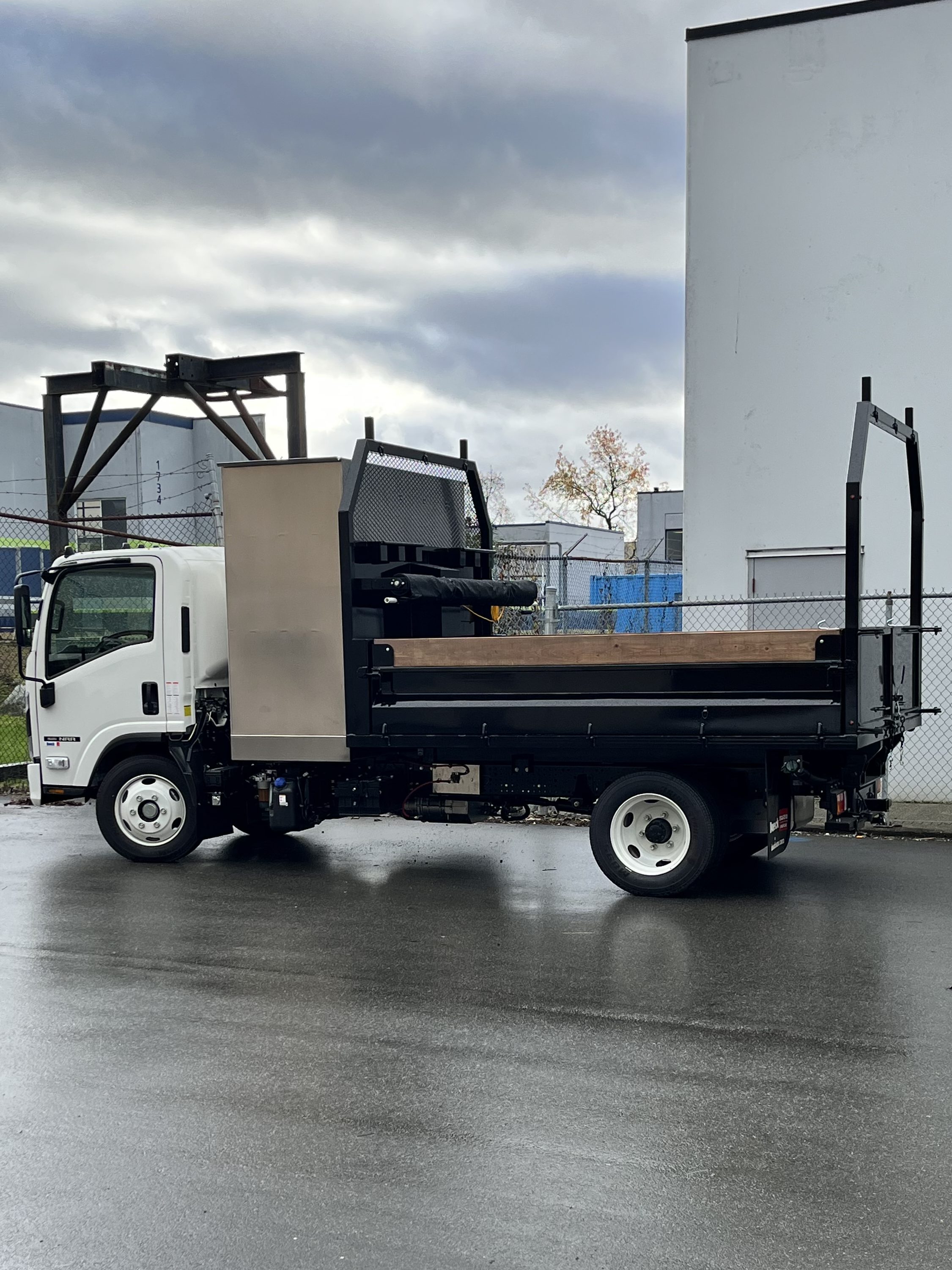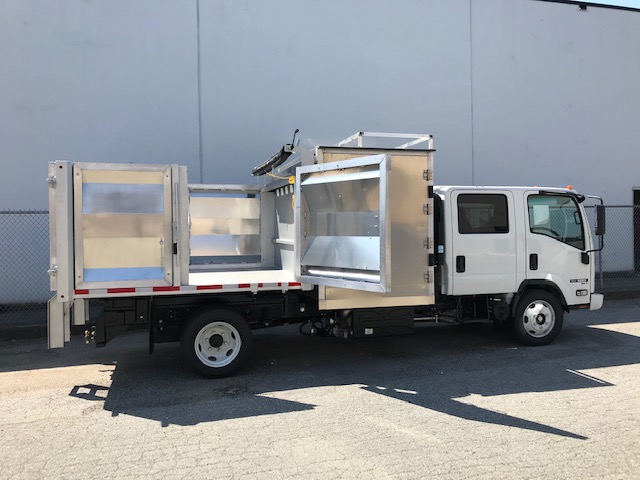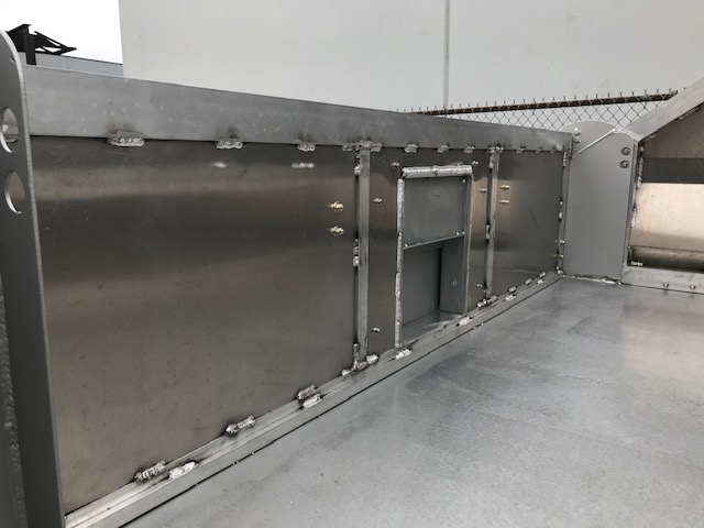 14 foot dump 28 High Aluminum Drop Down Walls 24x66x84 High Cross Box with Custom Shelves, Shovel Holder Rack , Gravel Chute